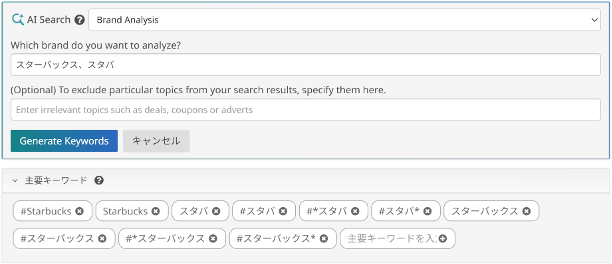 キーワード設定をAIがアシスト。分析したいキーワードを1 つ入力すると、候補となる関連キーワードをAI が自動生成。